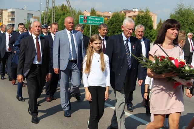 Po mszy wszyscy zebrani w pochodzie udali się pod pomnik poległych żołnierzy 71. Pułku Piechoty mieszczący się przy. ul. Prymasa Stefana Wyszyńskiego. Ta część uroczystości rozpoczęła się uczczenia minutą ciszy zmarłego ś.p. Leszka Zbijewskiego - syna ppłk. dypl. Adama Zbijewskiego - dowódcy 71. Pułku Piechoty, który przeżywszy 80 lat zmarł w dniu 22 maja 2017 roku.
