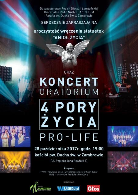 28 października w kościele pw. Ducha św. w Zambrowie odbędzie się uroczystość wręczenia statuetek "Anioł Życia" oraz koncert Oratorium Pro-Life 4 Pory Życia.