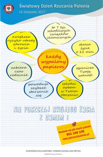 W związku z obchodami Światowego Dnia Rzucania Palenia przypadającego na 16 listopada 2017 roku inicjowanego przez Światową Organizacje Zdrowia, Państwowy Powiatowy Inspektor Sanitarny w Zambrowie przypomina o zbliżającej się kampanii, kierowanej w roku bieżącym głównie do młodych kobiet.