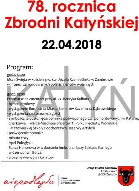 Burmistrz Miasta Zambrów serdecznie zaprasza na uroczystość poświęconą 78. rocznicy Zbrodni Katyńskiej, która odbędzie się w najbliższą niedzielę 22.04.2018 r.