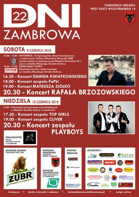 9 - 10 czerwca 2018r. odbędą się 22 Dni Zambrowa. Wystąpią między innymi: Dawid Kwiatkowski, Mateusz Ziółko, Rafał Brzozowski oraz gwiazdy sceny disco polo zespoły: Top Girls, Cliver oraz Playboys.