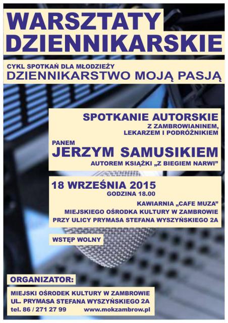 Dyrektor Miejskiego Ośrodka Kultury w Zambrowie serdecznie zaprasza na warsztaty dziennikarskie z cyklu spotkań dla młodzieży z Jerzym Samusikiem.