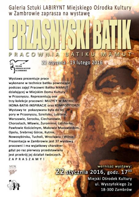 Wystawa prezentuje prace wykonane w technice batiku powstające podczas zajęć w Pracowni Batiku Mamut działającej przy Miejskim Domu Kultury w Przasnyszu.