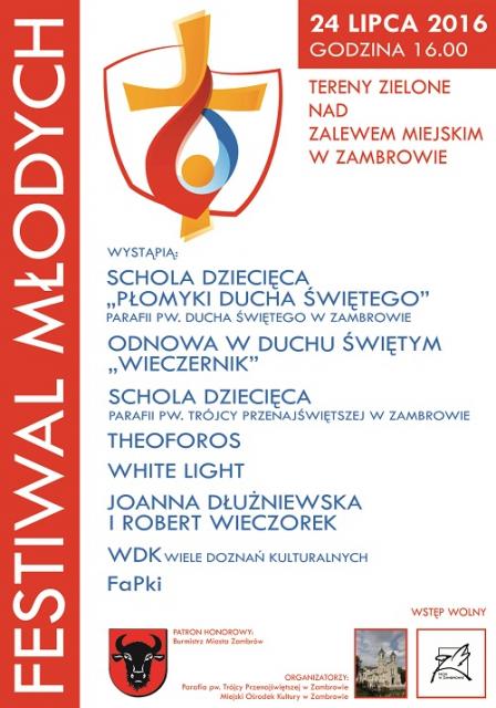 Miejski Ośrodek Kultury w Zambrowie oraz Parafia pw. Trójcy Przenajświętszej w Zambrowie serdecznie zapraszają na Festiwal Młodych.