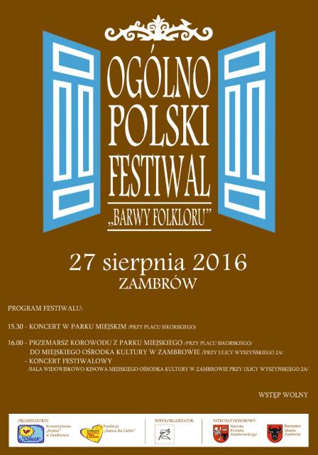 Dyrektor Miejskiego Ośrodka Kultury w Zambrowie serdecznie zaprasza na Ogólnopolski Festiwal "Barwy Folkloru".