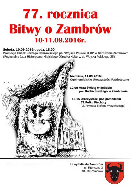 Urząd miejski zaprasza mieszkańców Zambrowa oraz okolic na uroczyste obchody 77. rocznicy Bitwy o Zambrów, które odbędą się w dniach 10 - 11.09.2016r.