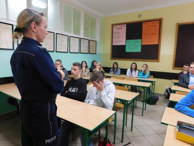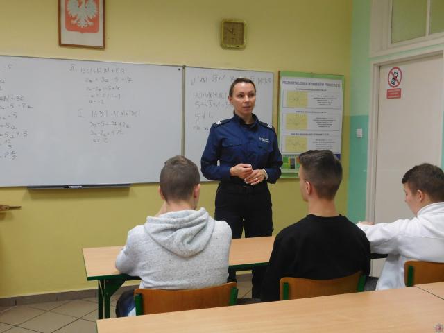 Mundurowi uczniom klas II wyjaśnili jakie zachowania są niezgodne z prawem, omówili zagadnienie związane z odpowiedzialnością prawną nieletnich za popełniane czyny karalne, a także zachowania niezgodne z obowiązującymi normami społecznymi. Policjanci omówili również zagrożenia związane z korzystaniem z Internetu. Młodzi słuchacze z zaciekawieniem wysłuchali przygotowanej przez mundurowych prelekcji.