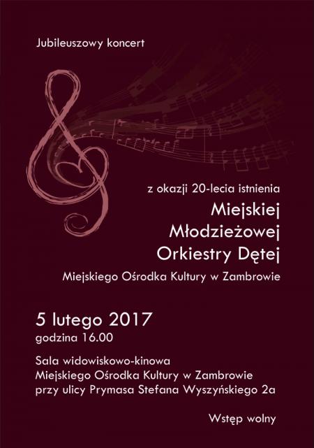 Dyrektor Miejskiego Ośrodka Kultury w Zambrowie serdecznie zaprasza na obchody 20-lecia Miejskiej Młodzieżowej Orkiestry Dętej w Zambrowie.
