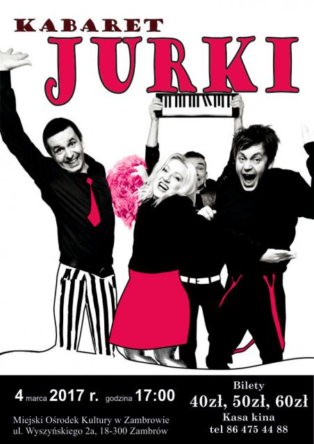 Kabaret Jurki to jeden z filarów tzw. Zielonogórskiego Zagłębia Kabaretowego, znany fanom kabaretu z kultowego serialu improwizowanego Spadkobiercy (Agnieszka "Marylka" Litwin Sobańska w roli Harriet oraz Znany Wojtek Kamiński w roli Kena). Trójka scenicznych indywidualności, od lat współpracująca ze sobą, doskonale umiejąca odczuć potrzeby publiczności. Ich twórczość zdominowana jest przez tematy społeczno-obyczajowe. Z upodobaniem sięgają po "materiał ludzki", rozumiany zarówno jako obserwacja ludzkich zachowań, jak i mierzenie się z osiągnięciami kultury. Kabaret Jurki czerpie także z tematów literackich, przetwarzając je za pomocą nieco absurdalnego poczucia humoru. Artyści tego kabaretu lubią bawić się formą, choć ich programy pozostają w sferze tzw. tradycyjnego kabaretu - na scenie przeplatają się skecze, pełne najróżniejszych bohaterów i szaleńczych zwrotów akcji, komiczne piosenki, monologi, a także elementy improwizacji.