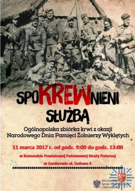 11 marca 2017 roku w Zambrowie odbędzie się ogólnopolska akcja honorowego oddawania pod hasłem "spoKREWnieni służbą", którą patronatem objął Minister Spraw Wewnętrznych i Administracji. Akcja została rozpoczęta 1 marca w Warszawie podczas obchodów Narodowego Dnia Pamięci "Żołnierzy Wyklętych". W zbiórkę krwi włączyły się także służby mundurowe - Komenda Powiatowa Policji oraz Komenda Powiatowa Państwowej Straży Pożarnej w Zambrowie, na której terenie w godzinach od 09:00 do 13:00 odbędą się powyższe działania.