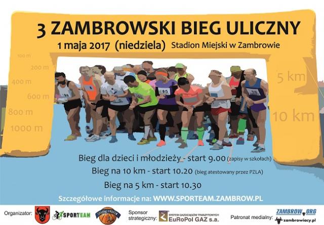 1 maja 2017r. na Stadionie Miejskim w Zambrowie odbędzie się 3 Zambrowski Bieg Uliczny. Organizatorami biegu są: Burmistrz Miasta Zambrów, Stowarzyszenie Sportowo Rekreacyjne SPORTEAM, Uczniowski Klub Sportowy ORKAN przy Szkole Podstawowej Nr 3.